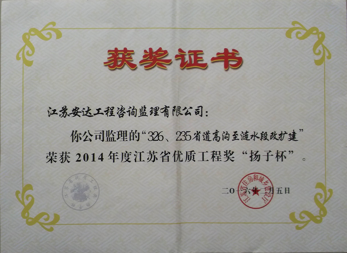 326、235省道高沟至涟水段改扩建工程荣获2014年度“扬子杯”
