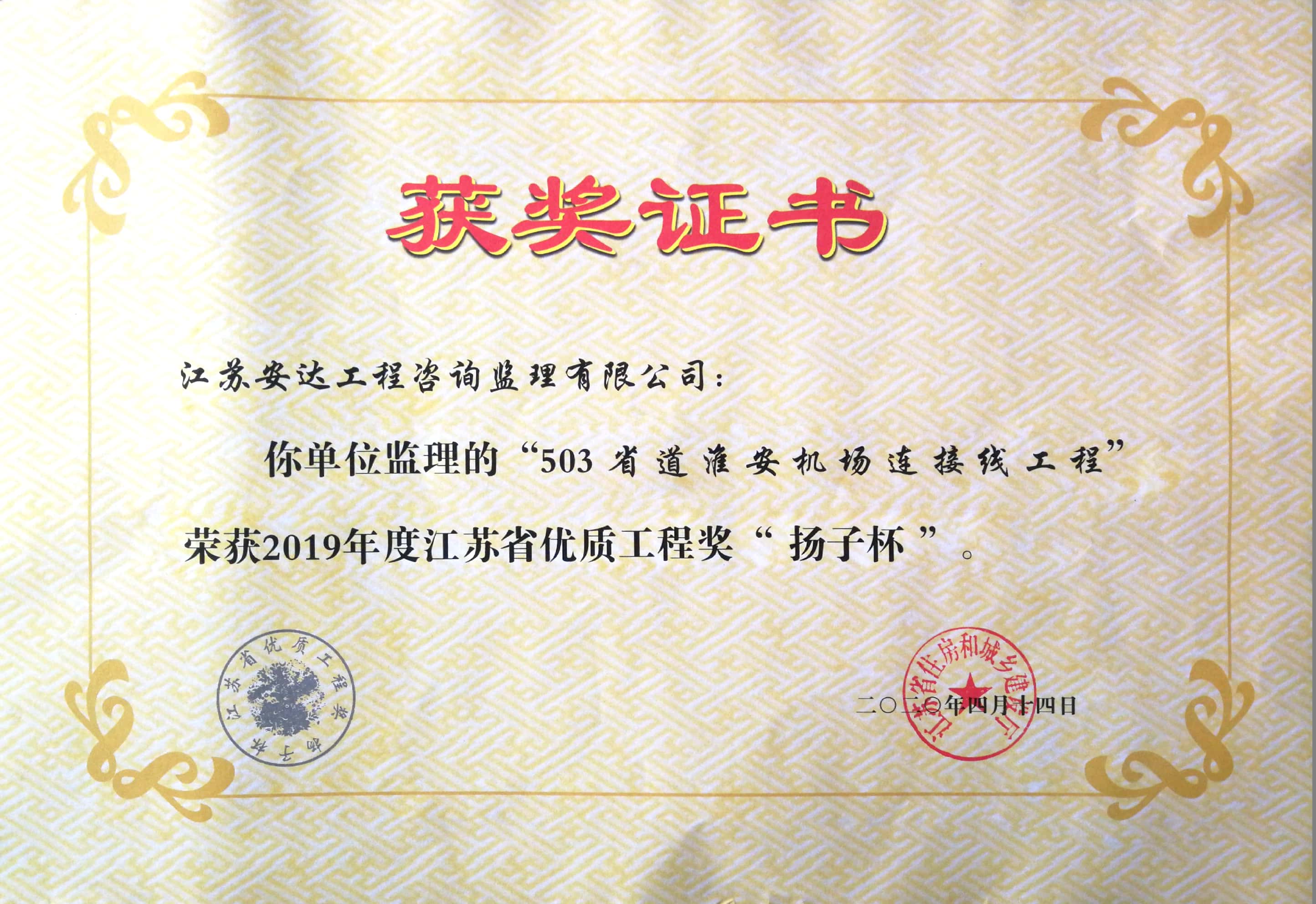 503省道淮安机场连接线工程荣获2019年度江苏省优质工程奖“扬子杯”