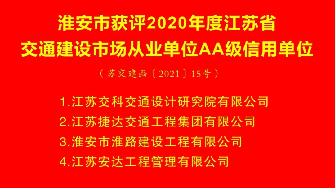 近日,江苏省交通运输厅以苏交建函〔2021〕15号文件公布了2020年度江苏省交通建设市场7532家从业单位的信用等级评定结果,共有90家从业单位获评AA级(最高等级),其中,淮安市共有4家单位获评AA级,开云体育-开云(中国)一站式服务官方网站