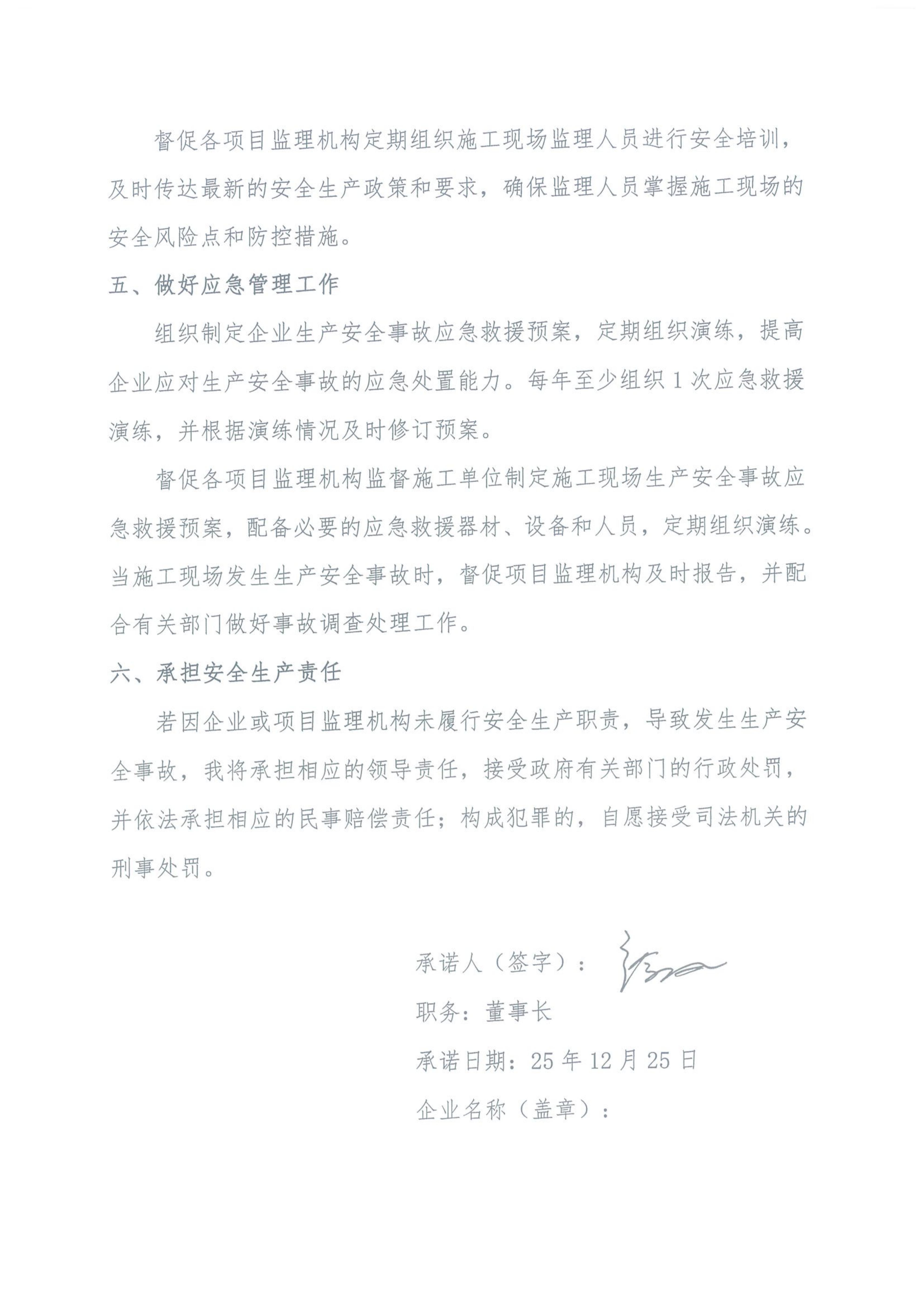 企业主要负责人安全承诺书