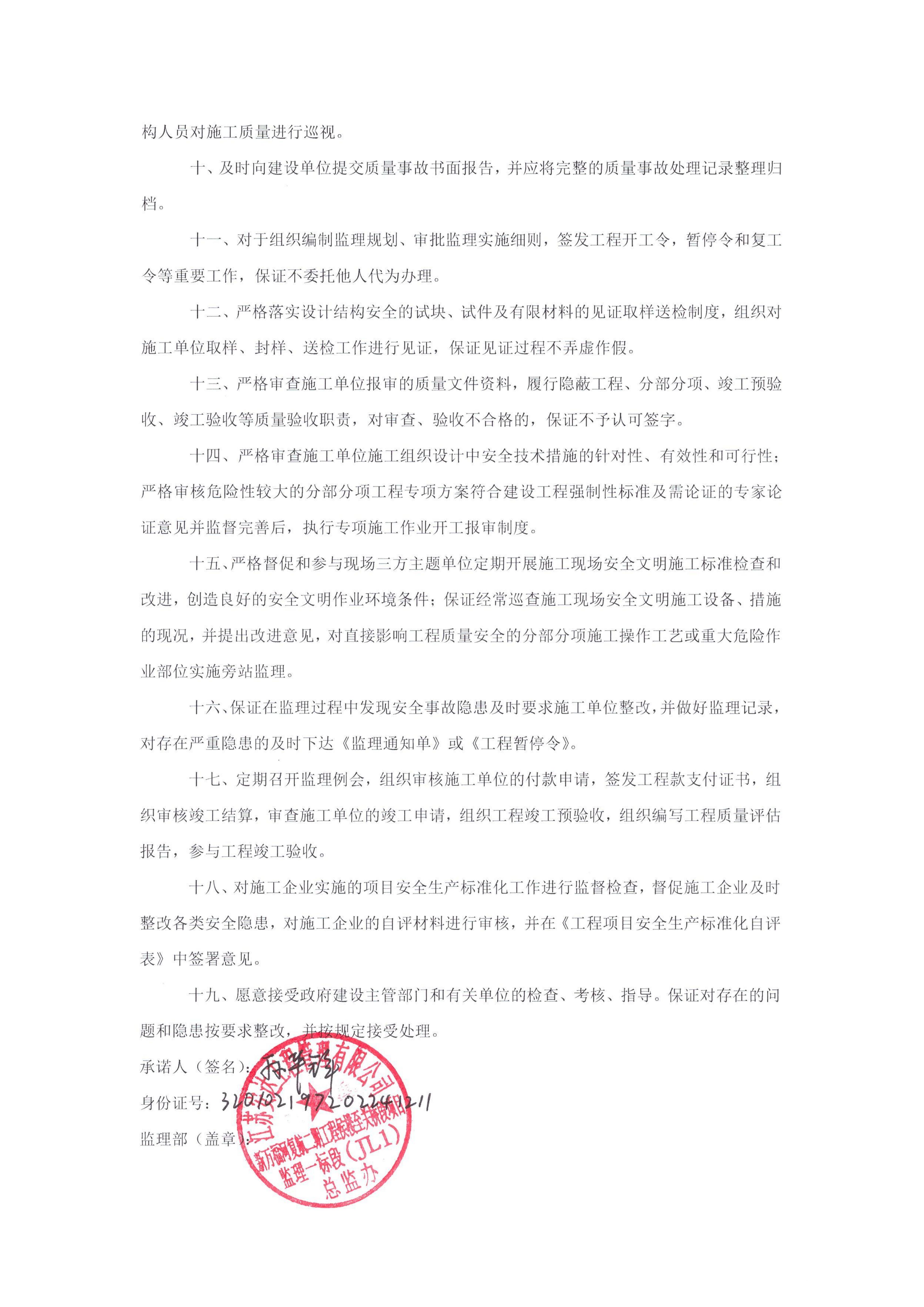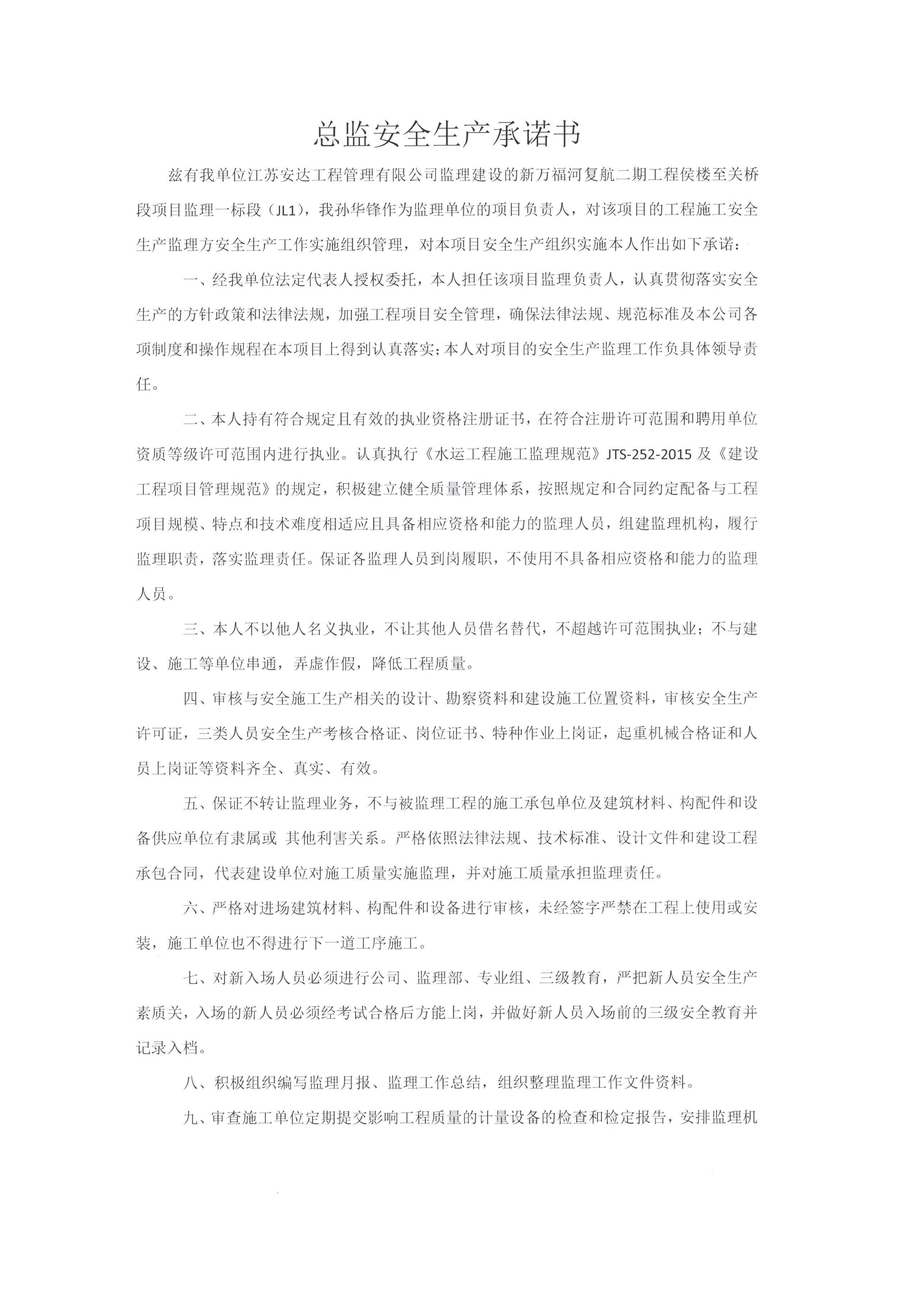 总监安全生产承诺书