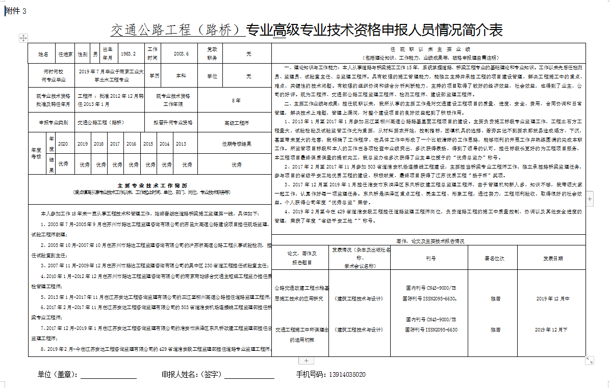 交通公路工程路桥专业高级专业技术资格申报人员情况简介表