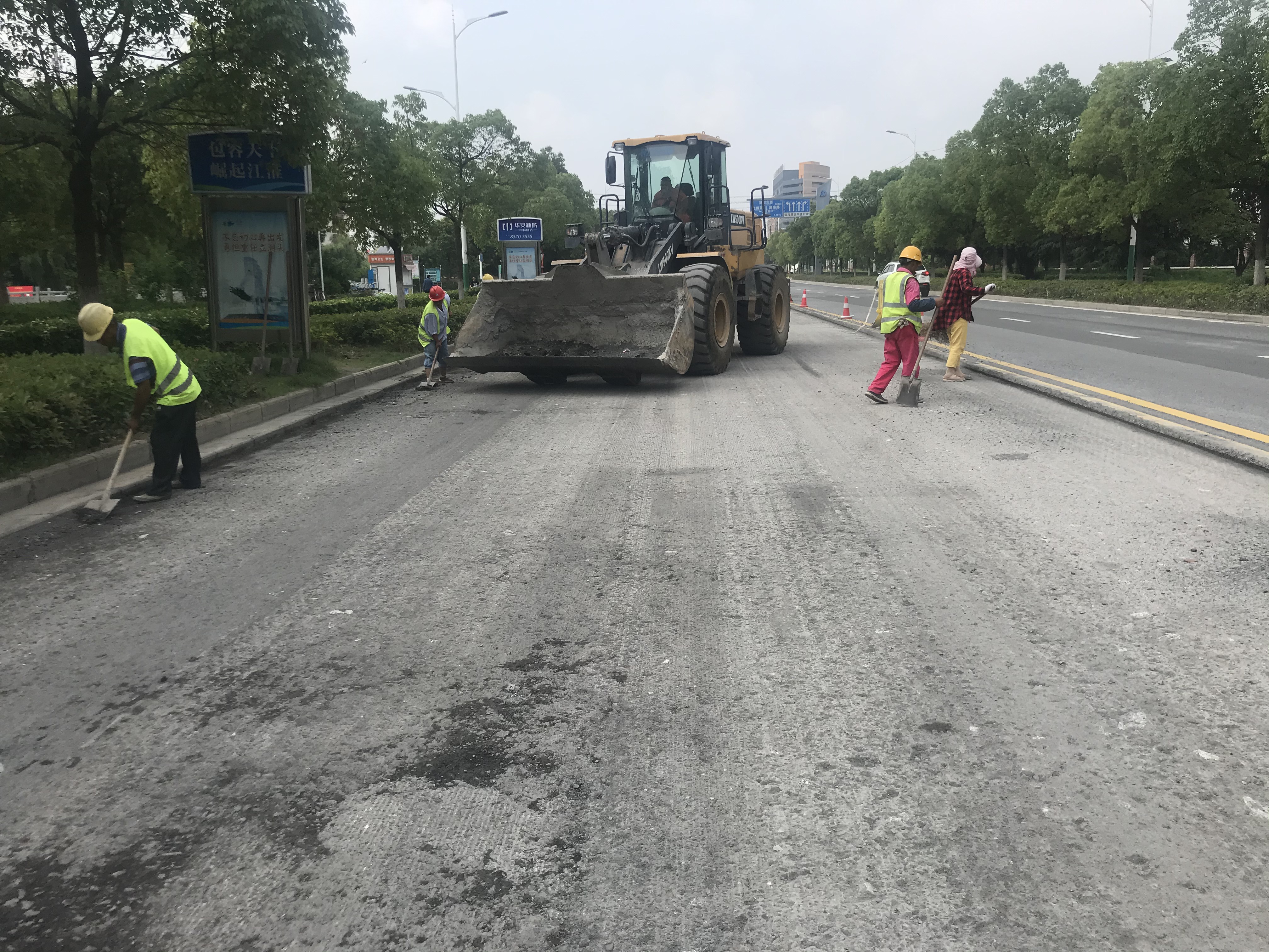 安澜路(鸿海路—富誉路)铣刨后老路进行清扫,洒粘层油,准备加摊辅沥青混凝土路面层。