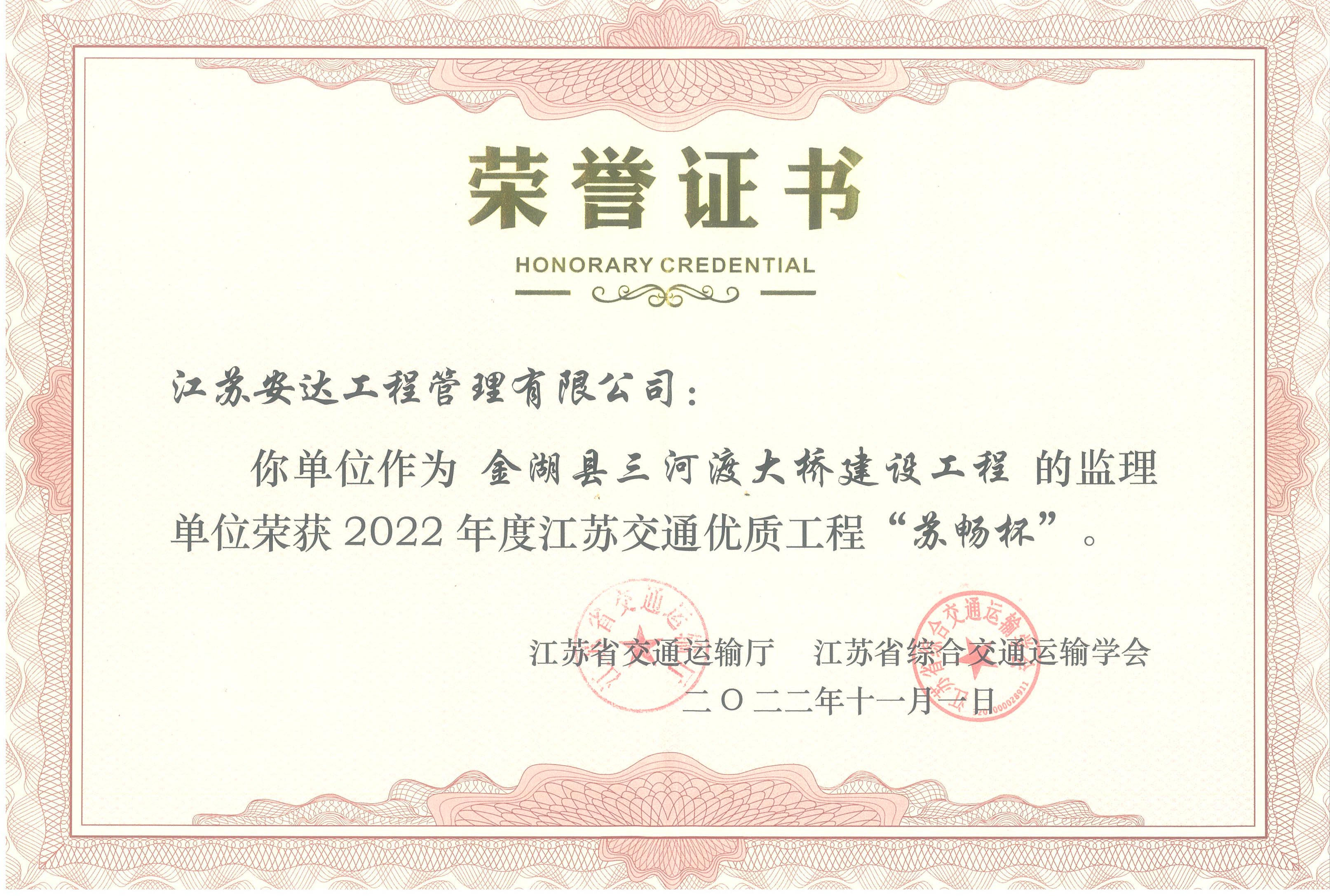 【公路】金湖县三河渡大桥建设工程监理荣获2022年度江苏交通优质工程“苏畅杯”