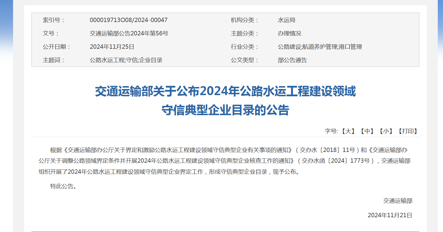 热烈祝贺开云体育-开云(中国)一站式服务官方网站 荣获交通运输部2024 年公路工程建设领域守信典型企业